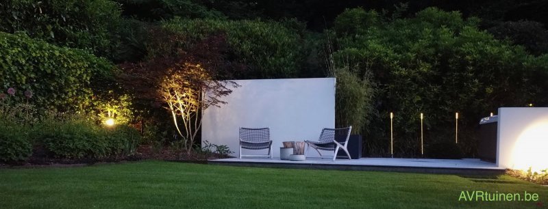 Tuinverlichting brengt ’s avonds extra sfeer en comfort. Subtiele spots lichten op in de beplanting en rond het terras, en zorgen tegelijk voor voldoende licht bij het gebruik van de spa. Het waterelement, een vijverpartij vlak bij de woning, vormt het kloppend hart van de tuin. Vanop de ontbijttafel, het terras en de loungehoek blijft het zicht op het water en de koi's een rustgevend gegeven, op elk moment van de dag.